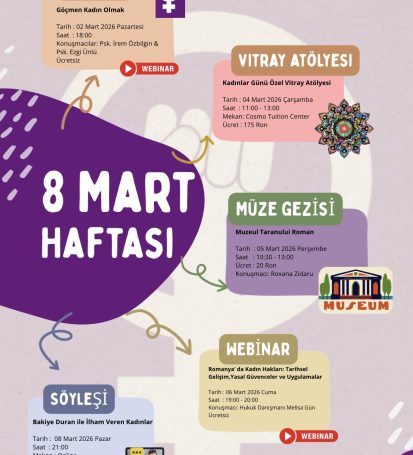 Romanya Yaşam Desteği Derneği (ROYAD) olarak, 8 Mart haftası kapsamında toplumsal cinsiyet eşitliği, kadınların güçlendirilmesi ve sürdürülebilir sosyal dayanışma konularına odaklanan bir dizi etkinlik planladık. Programımız; farkındalık konuşmaları, deneyim paylaşım oturumları ve katılımcı etkileşimini destekleyen faaliyetlerden oluşmaktadır.