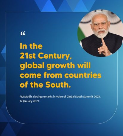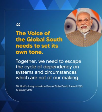 India a susținut întotdeauna un rol mai mare pentru țările în curs de dezvoltare în determinarea viitorului nostru comun. Pe măsură ce India își începe președinția G20 în acest an, este firesc ca scopul nostru să fie amplificarea Vocii Sudului Global. Pentru Președinția noastră G-20, am ales tema: „Un pământ, o familie, un viitor”. Aceasta este în conformitate cu etosul nostru civilizațional. Credem că calea pentru realizarea „unității” este prin dezvoltarea centrată pe om. Oamenii din Sudul Global nu ar mai trebui excluși de la roadele dezvoltării. Împreună trebuie să încercăm să reproiectăm guvernanța politică și financiară globală. Aceasta poate elimina inegalitățile, poate mări oportunitățile, poate sprijini creșterea și răspândi progresul și prosperitatea. Pentru a redinamiza lumea, ar trebui să solicităm împreună o agendă globală de „Răspunde, recunoaște, respect și reformă”: Să răspundă priorităților Sudului Global prin elaborarea unei agende internaționale incluzive și echilibrate. Recunoașterea că principiul „responsabilităților comune, dar diferențiate” se aplică tuturor provocărilor globale. Respectarea suveranității tuturor națiunilor, statul de drept și soluționarea pașnică a diferendelor și disputelor; și Reformarea instituțiilor internaționale, inclusiv Națiunile Unite, pentru a le face mai relevante.”
